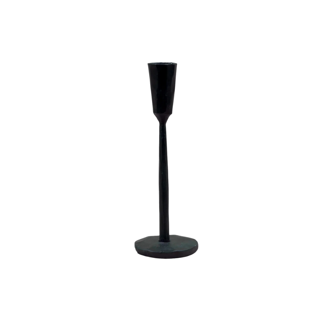 Deze robuuste kaarshouders, met de hand vervaardigd uit ijzer en afgewerkt in een diepe, matte zwarte kleur, voegen een krachtig, rauw detail toe aan elk interieur. Door het onafgewerkte, ruwe oppervlak creëren ze een prachtig contrast met gladde texturen zoals glas en zacht linnen.